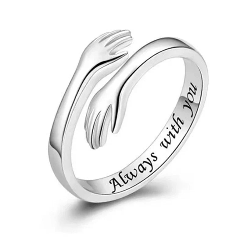 O Anel Abraço de Prata combina elegância e emoção, perfeito para quem deseja expressar afeto de forma única e sofisticada. Feito em liga de zinco durável, é um acessório que adiciona um toque especial ao visual e ao coração.